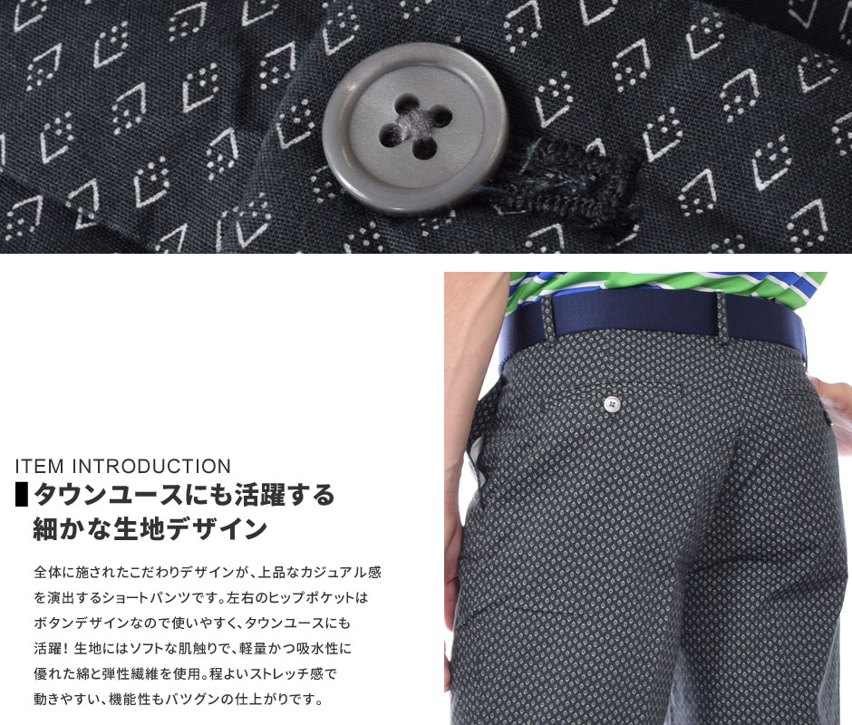 左右のヒップポケットはボタンデザインなので使いやすく、タウンユースにも活躍!生地にはソフトな肌触りで、軽量かつ吸水性に優れた綿と弾性繊維を使用。